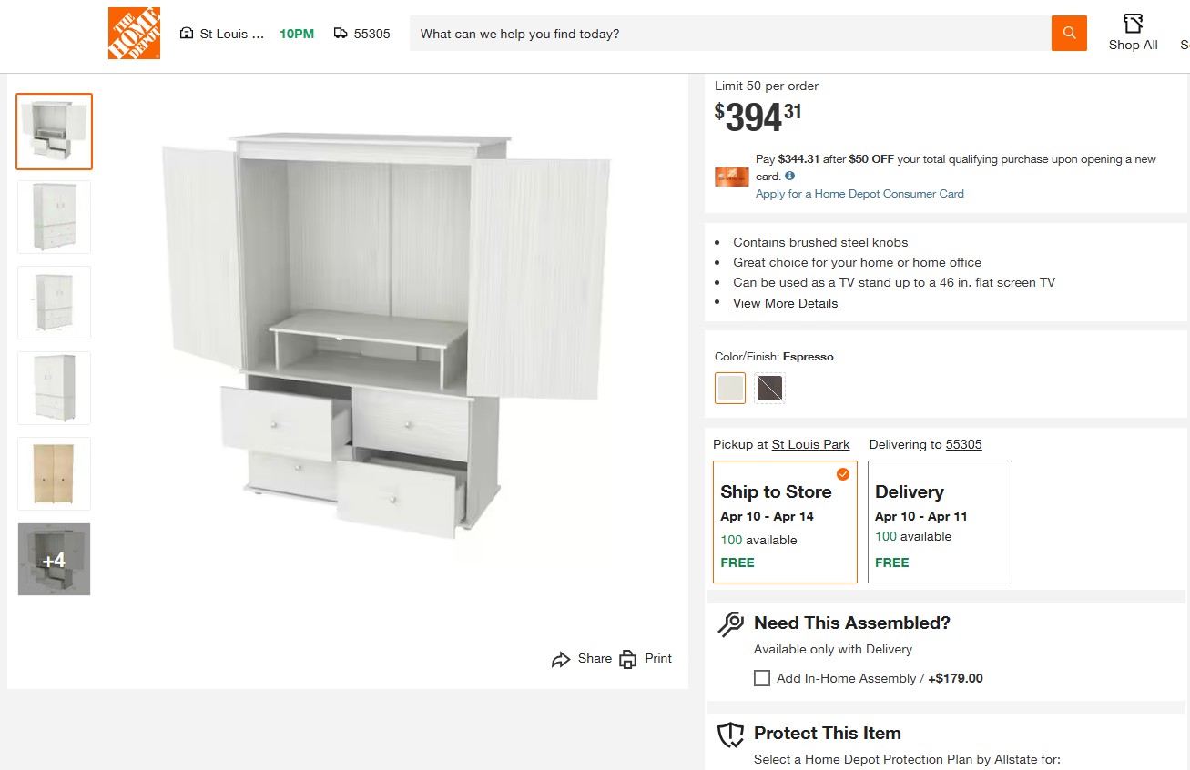 ARMOIRE W/4 DRAWERS WASHED OAK H70.9 W47.3 D19.7 2BOXES